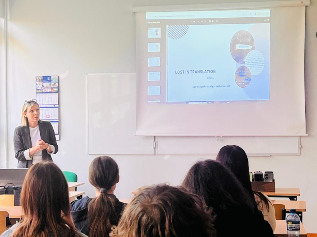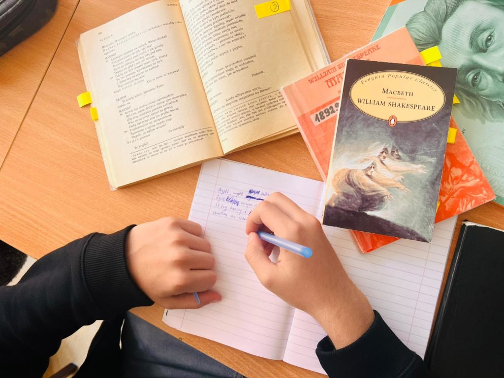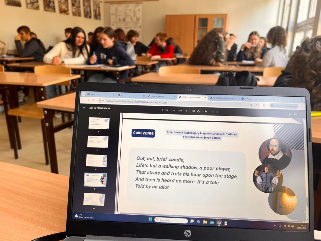 Nie zabrakło też części praktycznej – uczniowie spróbowali własnych sił w tłumaczeniu fragmentów „Makbeta” Williama Szekspira. Porównując swoje wersje z istniejącymi przekładami, mogli przekonać się, jak trudne, ale i fascynujące, jest oddanie ducha oryginału w innym języku.